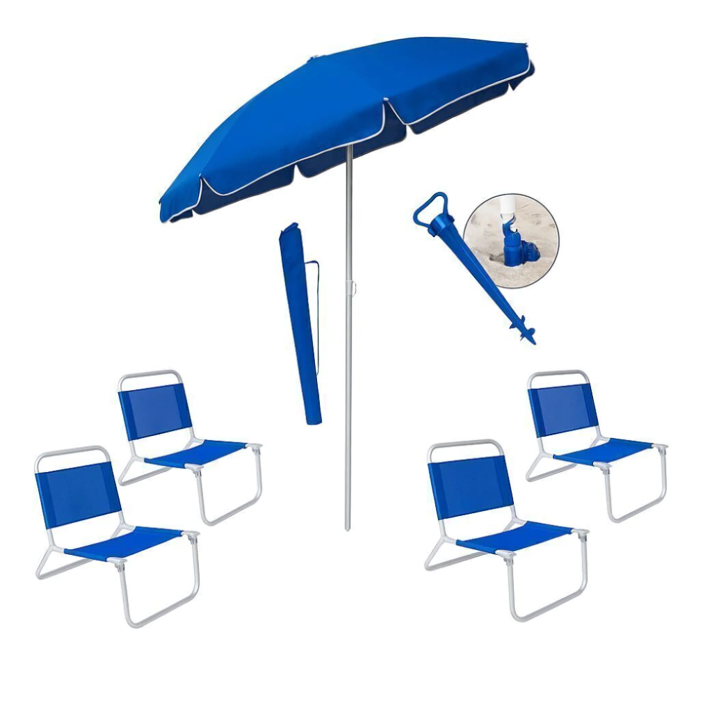 Disfrutá del verano con este combo ideal para tus días al aire libre. Incluye cuatro reposeras plegables de estructura de caño, junto con una sombrilla de 1.80 metros con sistema tirabuzón para una mejor fijación en la arena o tierra.